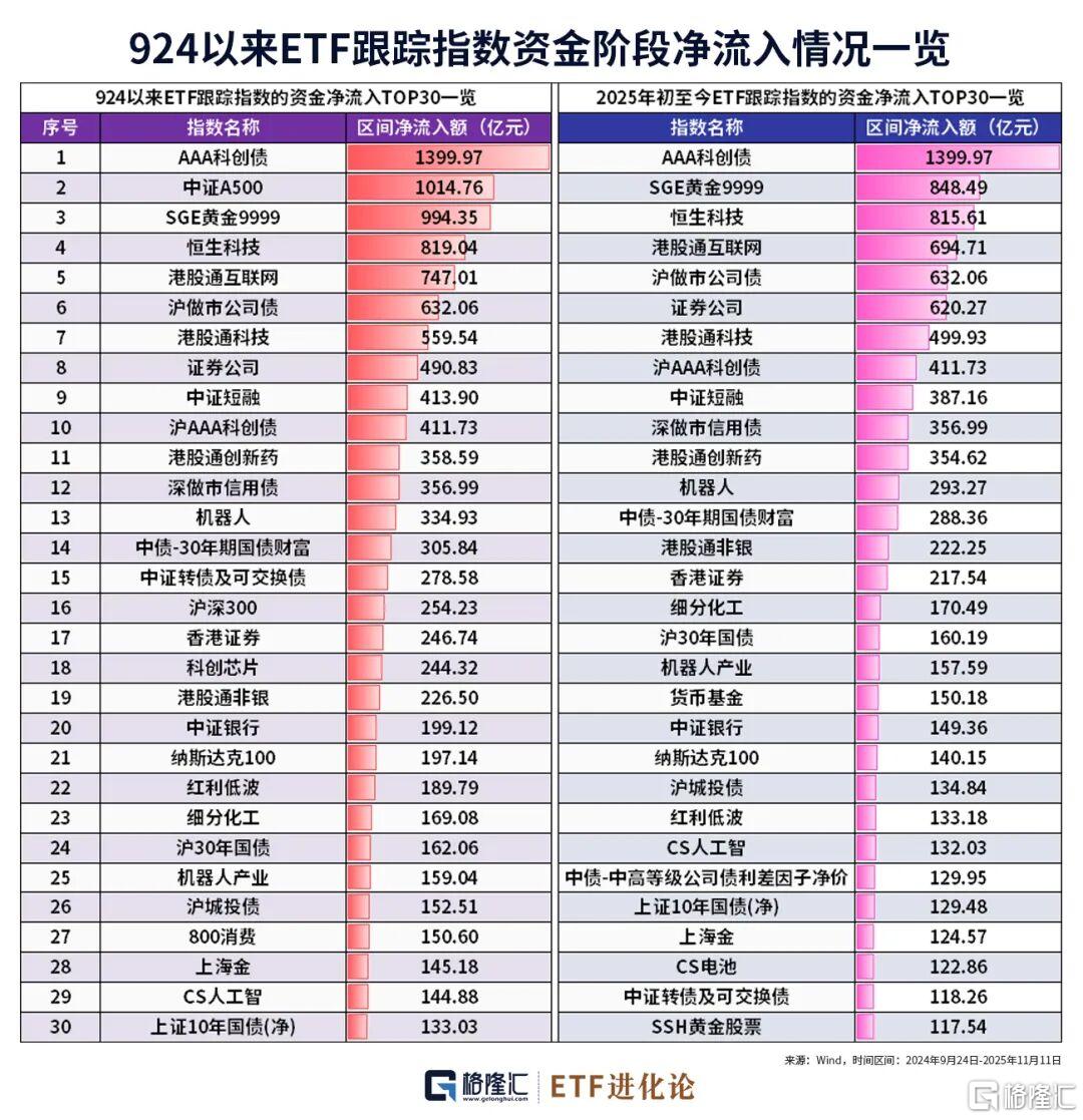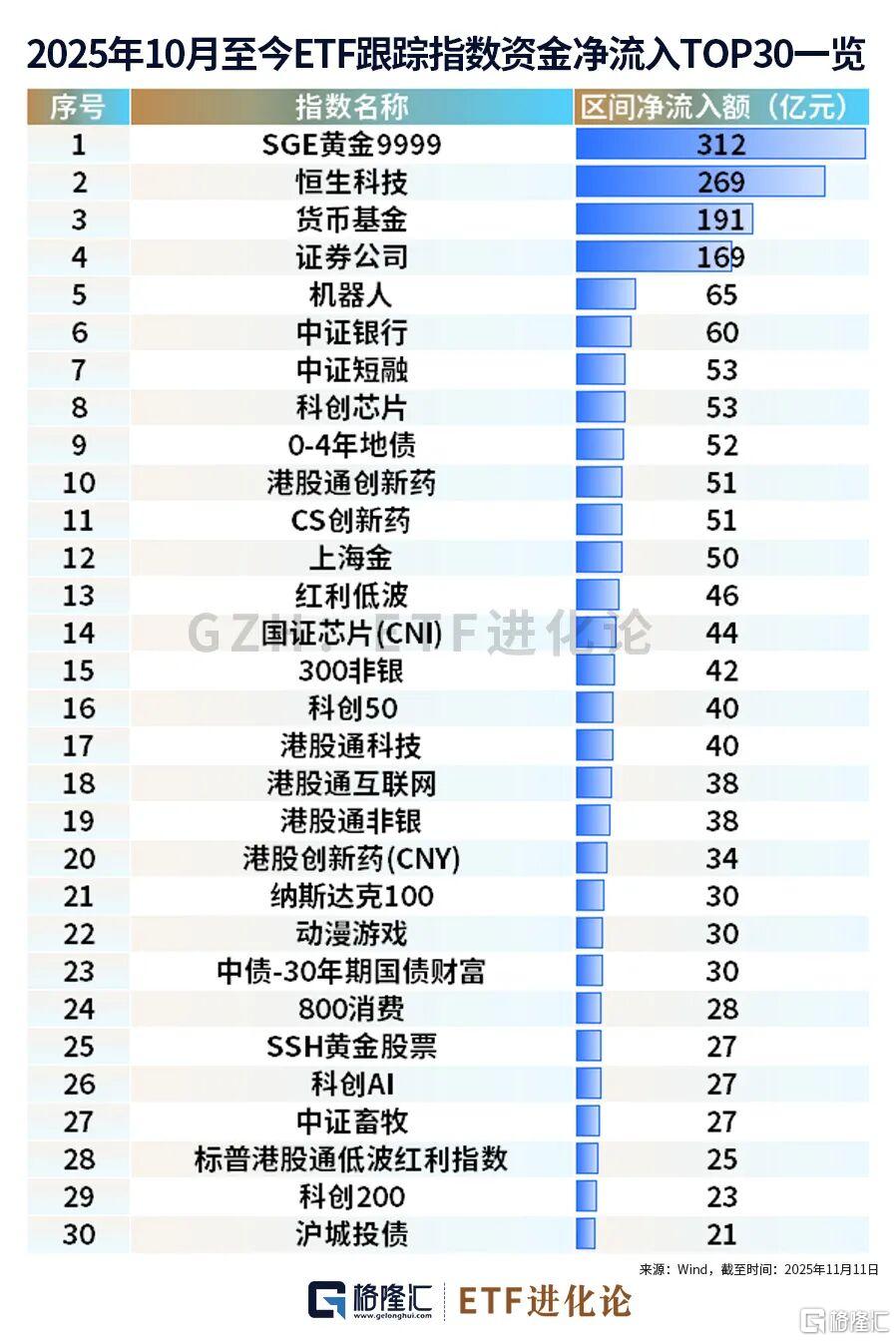 10月至今,1800亿资金继续借道ETF布局恒生科技、证券公司、机器人等指数,同时包含内需方向的800消费指数。