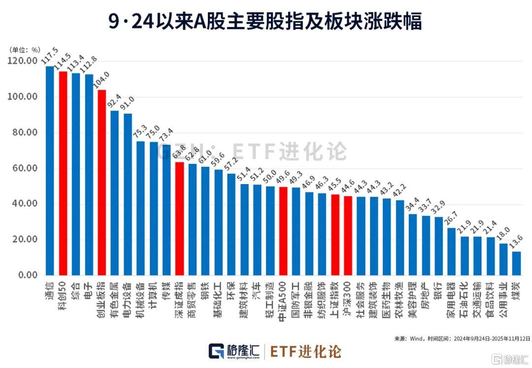 “924”至今,领涨方向则是以通信、电子、电力设备为代表的科技赛道,科创50、创业板指则是表现亮眼的宽基指数,背后的风口是科技自主、全球AI浪潮、以及DeepSeek催化下的中国资产重估叙事叠加。