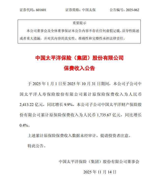11月13日,中国太保(601601.SH)公告称,其子公司太平洋人寿在2025年1月1日至10月31日期间累计原保险保费收入为2413.22亿元,同比增长9.9%;子公司太平洋财险累计原保险保费收入为1735.67亿元,同比增长0.4%。上述数据未经审计。