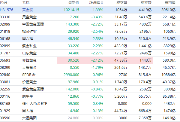 黄金股集体低开,截至发稿,灵宝黄金跌超3%,紫金矿业、山东黄金、赤峰黄金跌超2%。