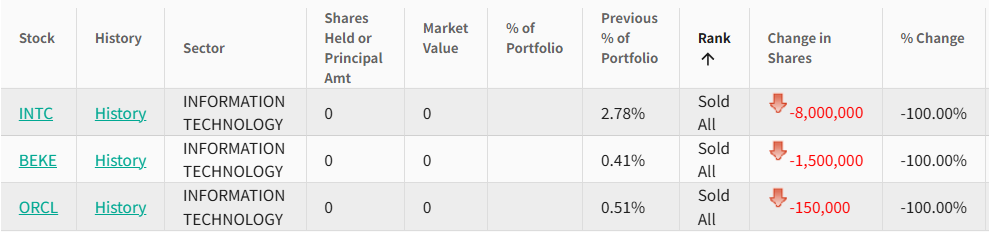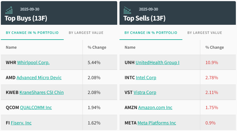 前五大卖出标的分别是:联合健康(UNH.US)、英特尔、Vistra Energy(VST.US)、亚马逊、Meta(META.US)。