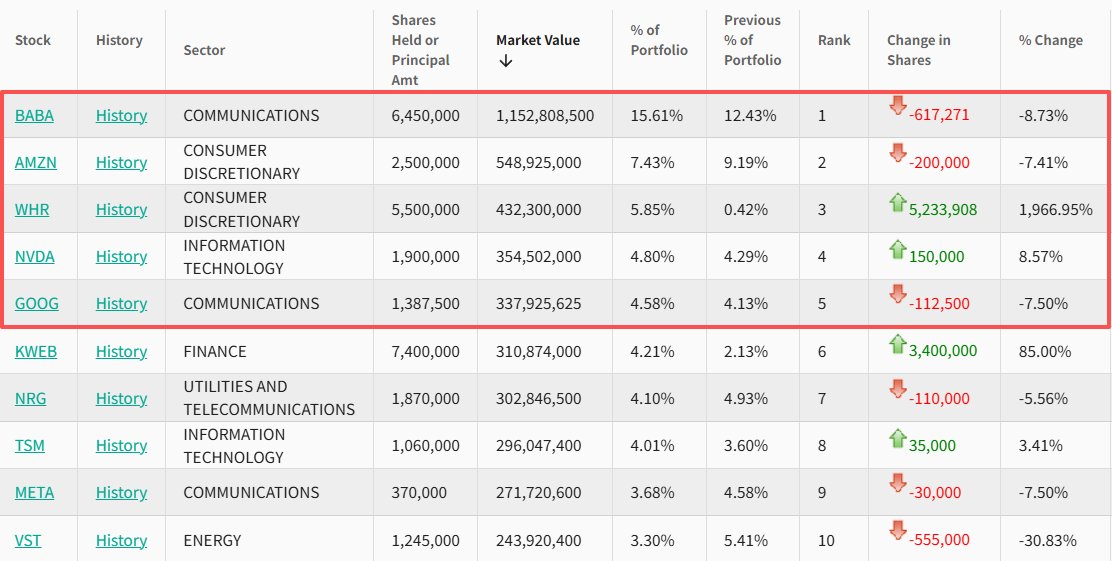 在前五大重仓股中,阿里巴巴(BABA.US)位列第一,持仓645万股,持仓市值约为11.5亿美元,占投资组合比例为15.61%,持仓数量较上季度下降8.73%。