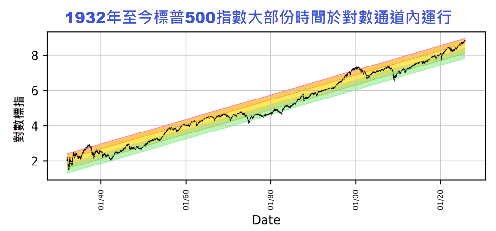出现此现象并不意外,因为根据统计学常态分布(Normal Distribution)的特性,若数据呈明显的“钟形曲线”形态(如标指长期对数走势所示),约95%的数据会落在平均值正负两个标准差之内。