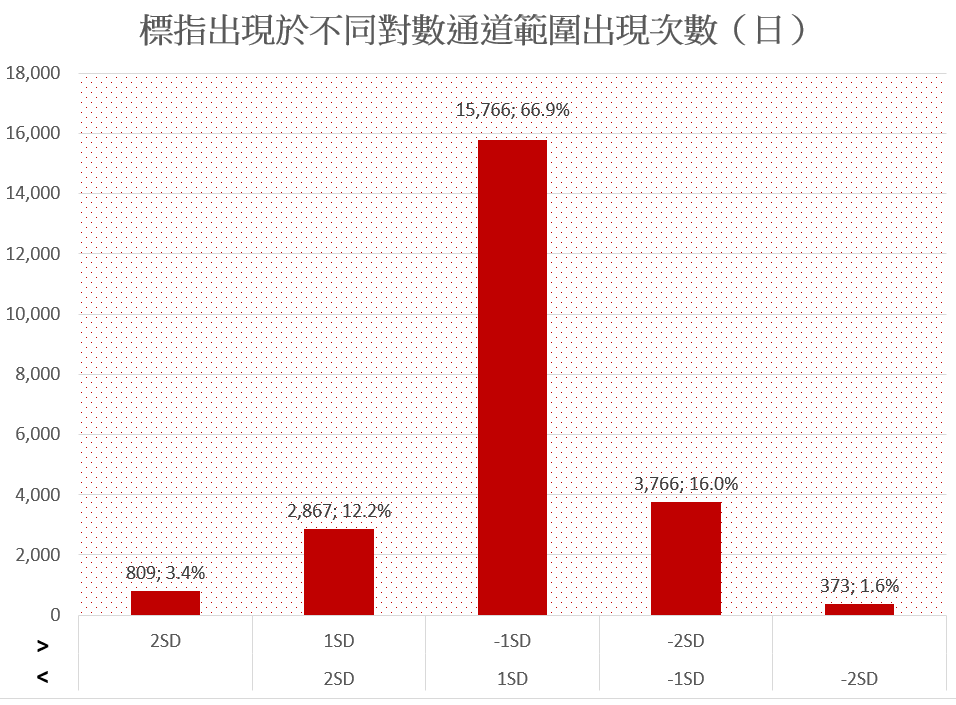 从技术分析角度看,自1932年至今近百年的数据显示,标普500指数大部分时间皆在一条向上倾斜的对数回归线(Logarithmic Regression)所形成的对数通道(Logarithmic Channel,图1)内运行,而该通道的上、下界分别为回归线加或减两个标准差(Standard Deviation)的位置。事实上,若统计标指在该通道内运行的(对数)分布,结果显示指数有多达约95%的时间(相当于近2.2万个交易日)均在此范围内波动(图2)。