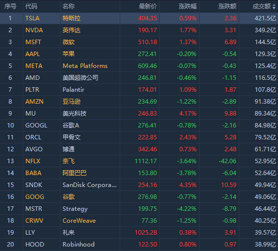 第9名美光收高4.17%,成交89.24亿美元。周五,美股存储概念股逆势拉升,此前有报道称,韩国三星电子(Samsung Electronics)在本月将某些对于全球存储端至关重要存储芯片价格较9月份大幅上调。