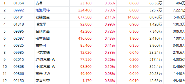 11月17日消息,港股新消费概念股盘初多数上扬,古茗、泡泡玛特涨超3%,老铺黄金涨超2%,布鲁可涨超0.4%。
