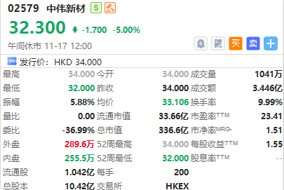 中伟新材上市首日破发,跌5%。公开发售阶段中伟新材获27.90倍认购,公开发售的发售股份最终数目为1042.26万股股份,占发售股份总数的约10%。合共接获约40241万份有效申请,受理申请数目13792份,申购一手获配发股份占所申请股份总数的概约百分比为10%。此外,国际配售阶段中伟新材获4.08倍认购,国际发售股份最终数目为9380.28万股股份,相当于发售股份总数的90%。