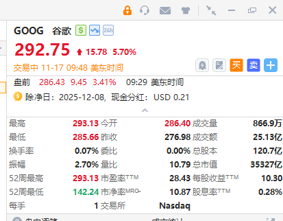 华盛资讯11月17日讯,谷歌涨幅扩大至近6%,股价再创历史新高,市值突破3.5万亿美元!Q3获巴菲特首次买入,跻身伯克希尔第十大重仓股>>