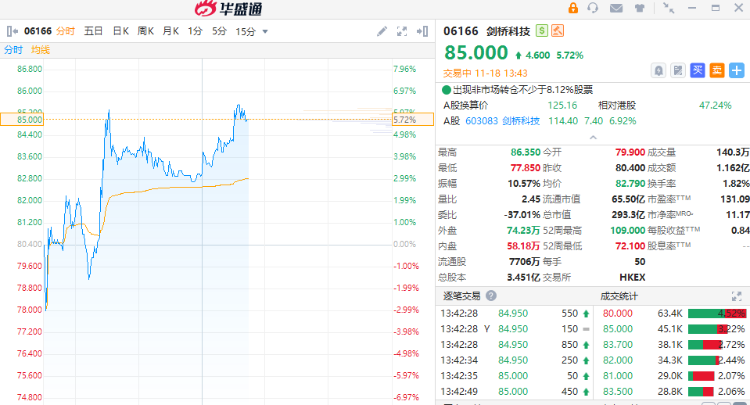 11月18日讯,港股剑桥国际逆势涨近6%,截至发稿,报85港元,成交额1.16万港元。
