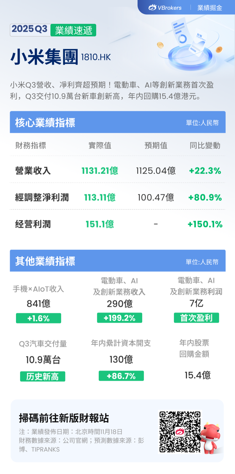 华盛资讯11月18日消息,小米集团-W公布截至2025年9月30日止的三季度业绩。