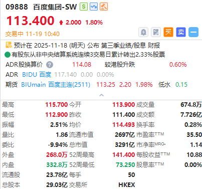 百度集团-SW绩后高开逾2%,截至发稿,涨1.8%,报113.4港元,成交额7.726亿港元。