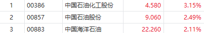 华盛资讯11月19日讯,港股石油股盘中持续上扬,截至发稿,中国石油化工股份涨超3%,中国石油股份、中国海洋石油涨超2%。