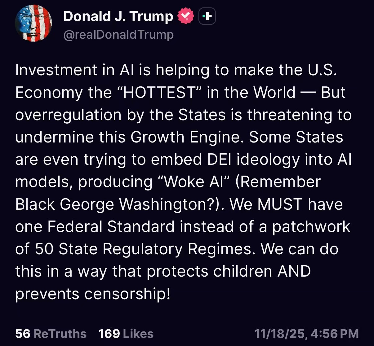 当地时间11月18日,美国总统特朗普在社交平台“真实社交”上发帖称,美国必须为人工智能制定统一的“联邦标准”,防止过度监管。