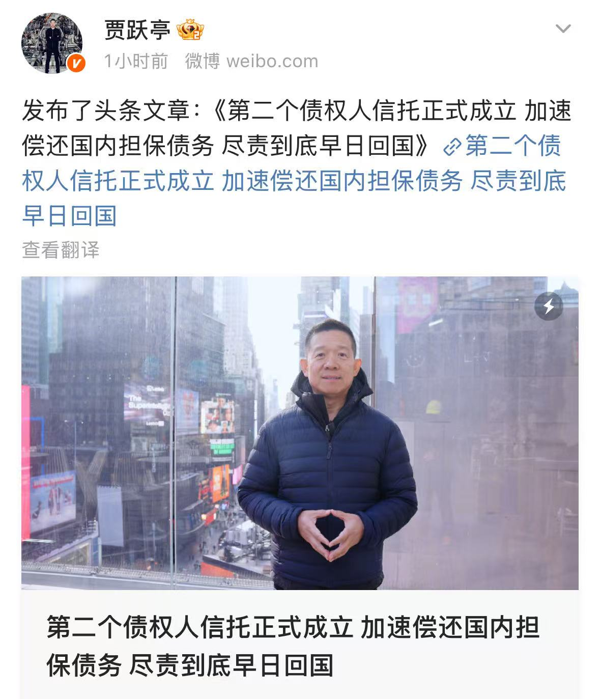 11月19日,Faraday Future(FF)创始人、联席CEO贾跃亭通过个人实名注册微博表示,他自愿新增的第二个债权人信托正式成立,加速偿还国内担保债务,争取早日回国。