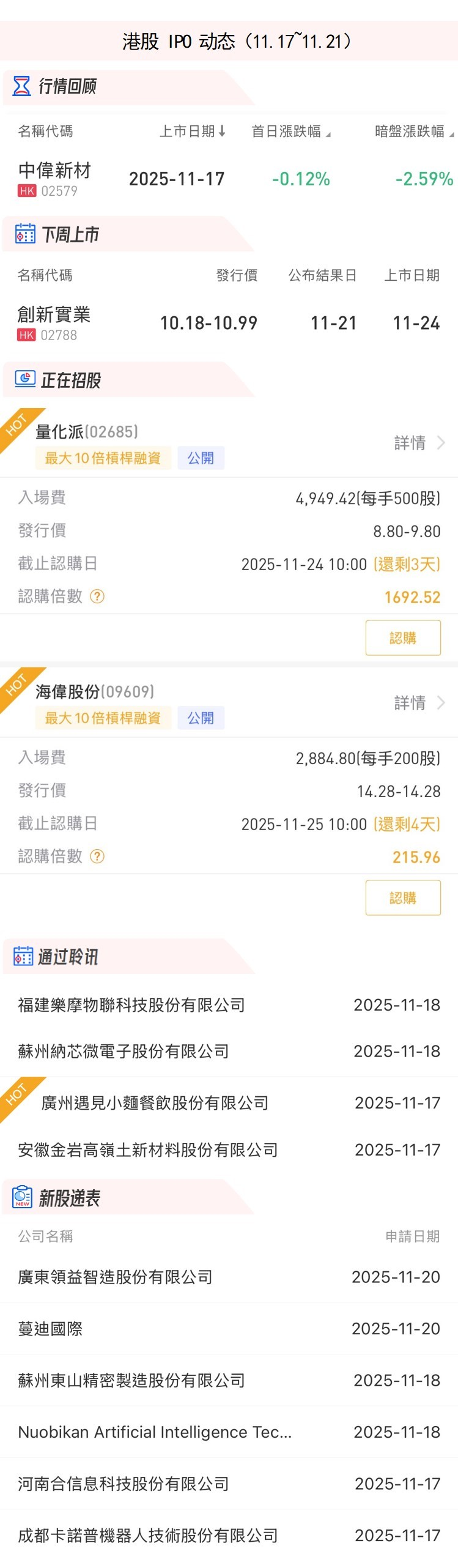 其中电解铝生产商创新实业截至发稿,暗盘涨超25%,将于下周一挂牌上市;量化派、海伟股份正在招股中;另有4家公司通过聆讯,包含A股半导体上市公司纳芯微,以及中国第四大中式面馆经营者遇见小面等公司。