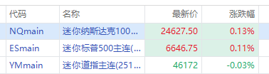 华盛资讯11月19日讯,三大期指盘前涨跌不一,纳指期货 $NQmain 涨0.13%,标普500指数期货 $ESmain 涨0.11%,道指期货 $YMmain 跌0.03%。