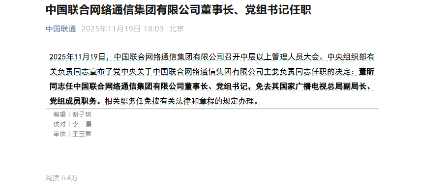 11月19日,据中国联通(600050.SH)官微消息,中国联合网络通信集团有限公司当天召开中层以上管理人员大会。中央组织部有关负责同志宣布了党中央关于中国联合网络通信集团有限公司主要负责同志任职的决定:董昕任中国联合网络通信集团有限公司董事长、党组书记,免去其国家广播电视总局副局长、党组成员职务。相关职务任免按有关法律和章程的规定办理。