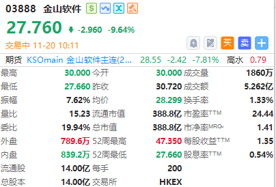 金山软件绩后跌近10%,截至发稿,跌9.64%,报27.76港元,成交额5.26亿港元。