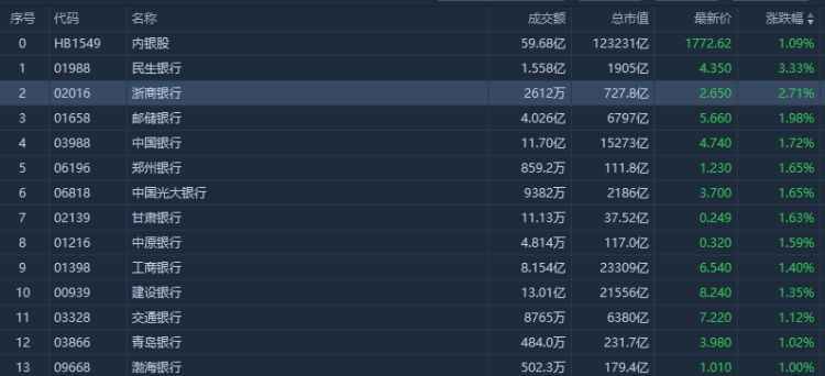 华盛资讯11月20日讯,内银股集体回暖,截至发稿,民生银行涨超3%,浙商银行涨超2%,邮储银行、中国银行、工商银行涨超1%。