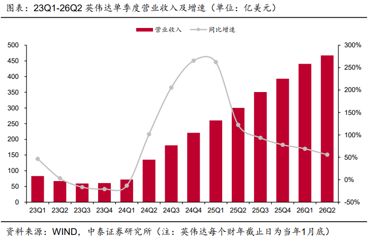 算力作为AI时代的基础设施,其长期增长逻辑依然坚实。中泰证券指出,自2024年以来,海外科技巨头资本开支持续攀升,展现出对AI基础设施的坚定投入。北美四大云服务商(CSP)——微软、谷歌、亚马逊和Meta,正加速将生成式AI融入传统业务,并大力开发AI原生应用。进入2025年后,四家厂商单季度资本开支均迈上百亿美元量级,其中亚马逊表现尤为突出,2025年Q2资本开支已达314亿美元。在此背景下,英伟达作为核心算力供应商,业绩持续强劲增长:自FY23Q4(对应2022年11月至2023年1月)以来,其单季度营收始终保持同比高速增长态势。