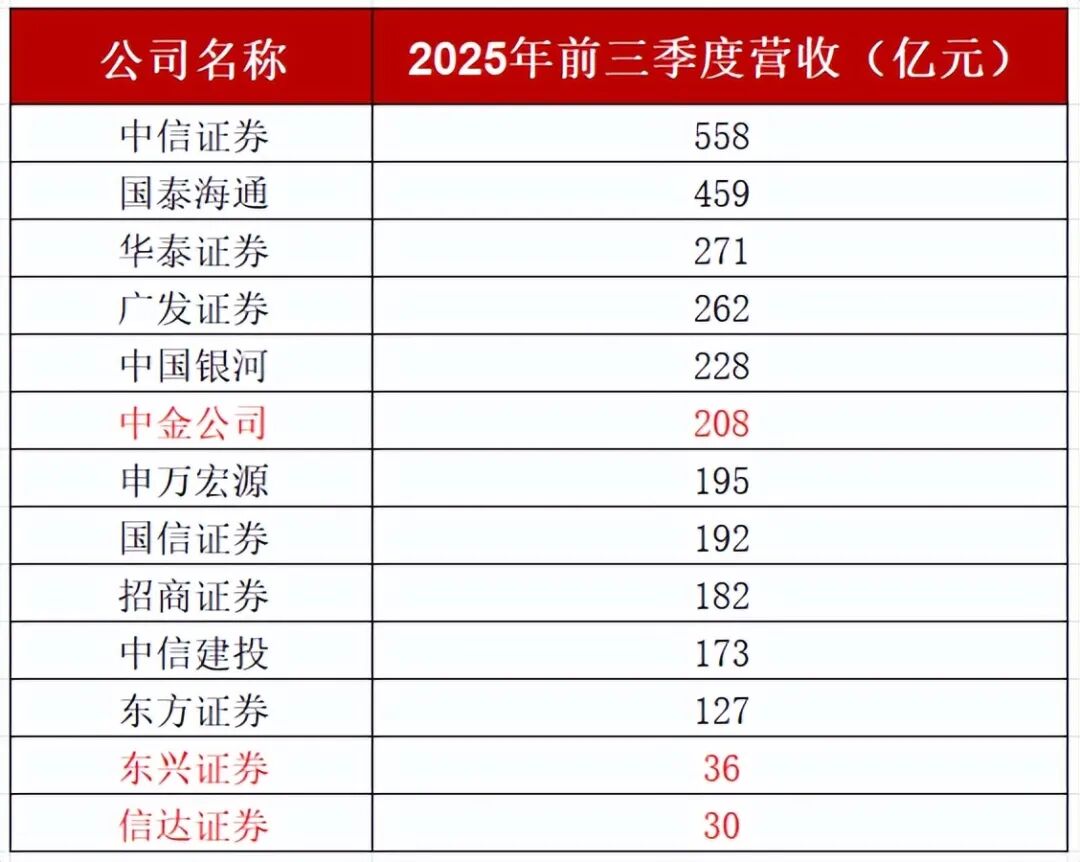从营收端看,今年前三季度,中金公司收入208亿元,位列第六,与资产规模一致;东兴和信达分别收入36亿元、30亿元,位列27、29位;三券商合并总收入将提高至274亿元,超过华泰证券,位列第三。