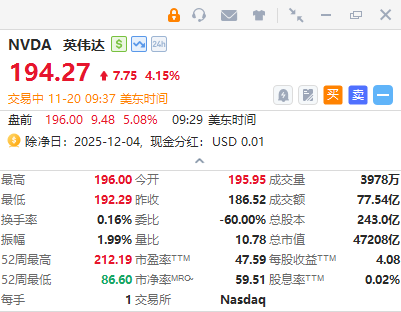 英伟达盘初大涨4%。消息面上,英伟达周三盘后公布Q3业绩,作为人工智能热潮核心的芯片销量增长速度超过了华尔街预期,同时公司给出强劲的当季营收预测。