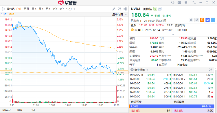 推动市场由盛转衰的关键因素是英伟达股价的急剧反转。尽管这家AI芯片巨头发布的季度业绩与第四季度销售指引均远超市场预期,股价盘初一度上涨5%,但随着盘中抛售压力增强,最终收跌3%。