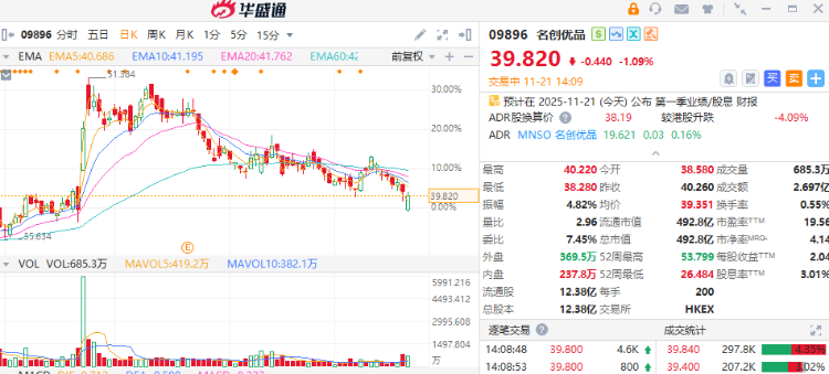11月21日讯,港股名创优品(09896)股价跌势缩窄至1%,美股夜盘反弹逾5%,公司午间公布Q3业绩喜忧参半,收入增长近3成,股东净利润跌逾3成。
