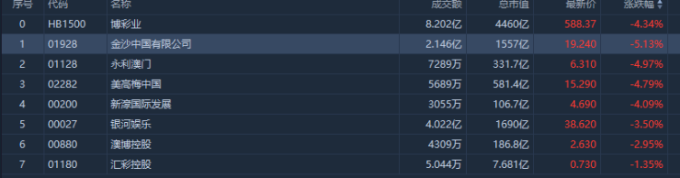 华盛资讯11月21日讯,博彩股全线下跌,截至发稿,金沙中国、永利澳门跌超5%,美高梅中国、新濠国际跌超4%,银河娱乐跌超3%。