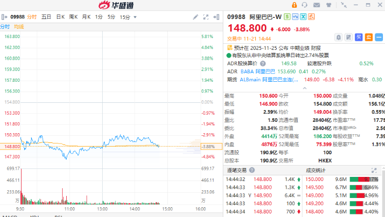 阿里巴巴(09988)下周二公布业绩,绩前股价显著回落,早段最多跌约半成,下试9月以来低位。