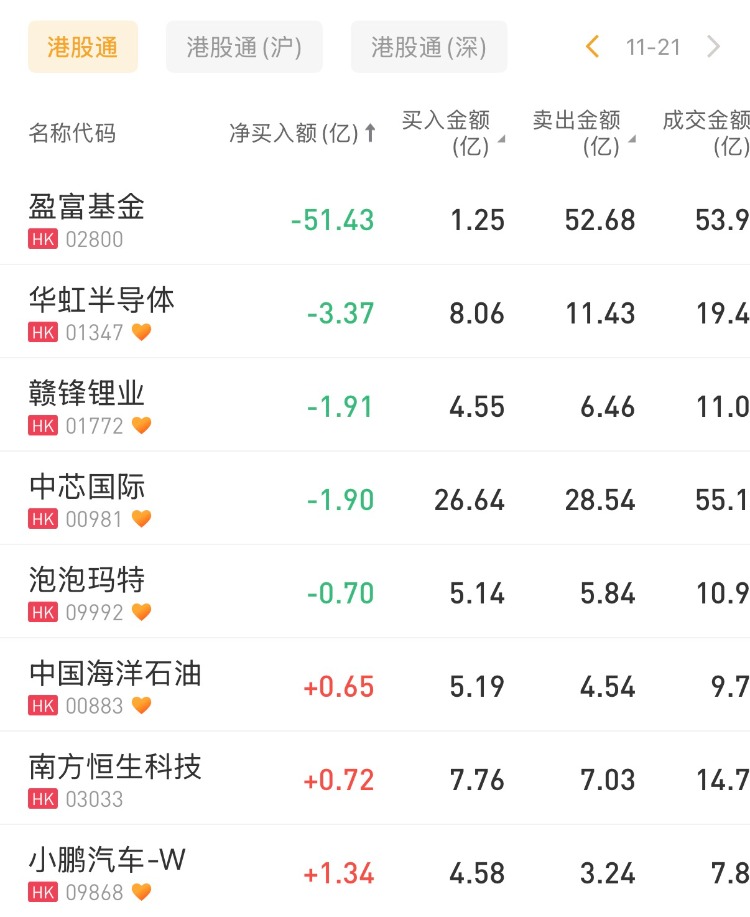 盈富基金、华虹半导体、赣锋锂业分别遭净卖出51.43亿港元、3.37亿港元、1.91亿港元。