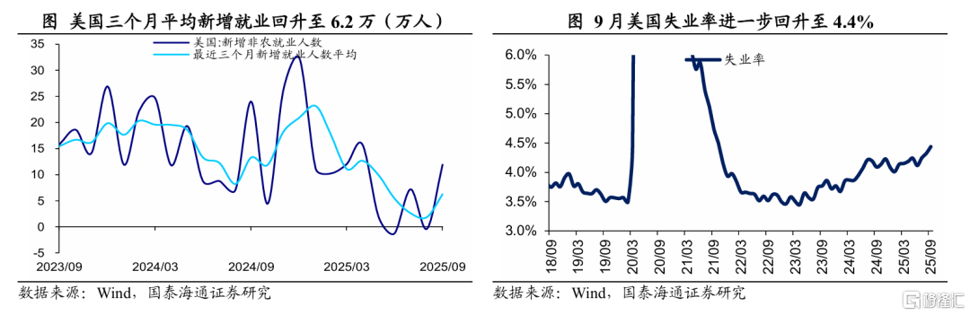 但同时数据也存在隐忧:第一,失业率在劳动参与率回升的影响下,进一步上升至4.4%,高于市场预期(4.3%)。第二,9月非农就业的增长仍集中在教育、医疗保健业、休闲和酒店业,增长基础并不广泛。(详见《美联储降息:或踩刹车——2025年9月美国非农数据点评》)