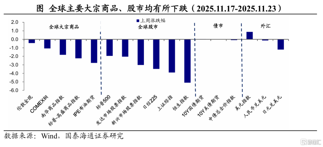 (2025.11.17-2025.11.23),多数资产价格均有明显下跌, 大宗商品方面, IPE 布油期货下跌 2.8% 。标普 - 高盛商品指数下跌 2.2% , COMEX 铜下跌 1.1%, ,伦敦金现下跌 0.4% ,幅度相对较小。主要经济体股市普遍下跌,其中,恒生指数下跌5.1%,幅度最大。上证综指下跌3.9%,日经225指数下跌3.5%,标普500指数下跌1.9%。新兴市场股票指数下跌3.0%,跌幅大于发达市场股票指数(下跌2.0%)。债市方面,10年期美债收益率较前一周回落8BP至4.06%,国内10Y国债期货价格与上周持平,中债总全价指数下跌0.1%。外汇市场方面,美元指数较前一周回升,报收100.15,人民币兑美元贬值0.1%,日元兑美元贬值1.2%。