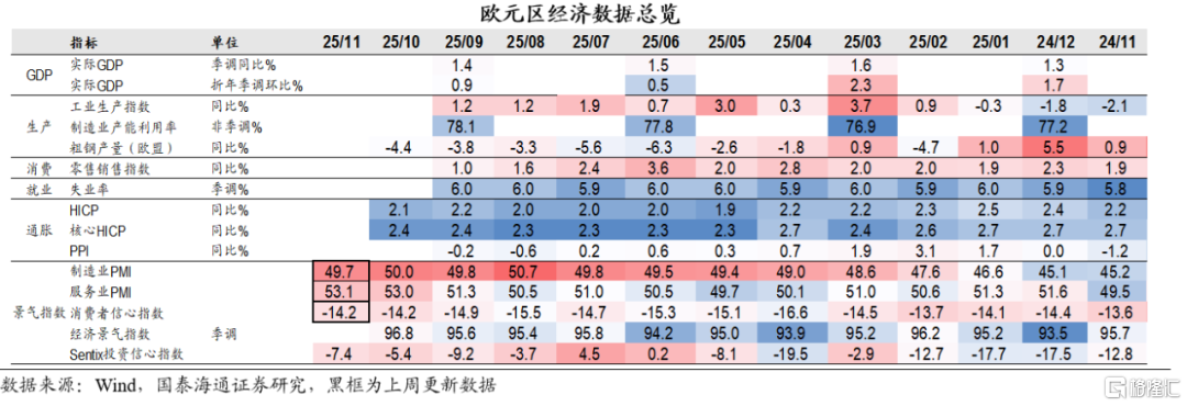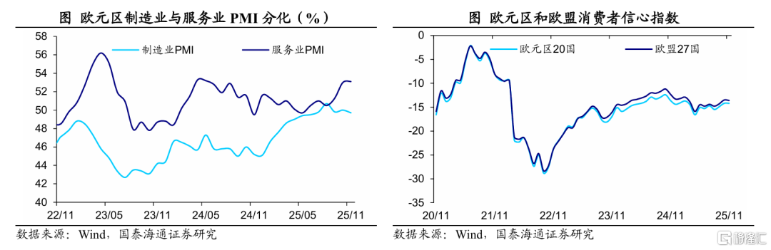欧元区服务业PMI继续回升。11月欧元区综合PMI由10月的52.5%小幅回落至52.4%,总体维持稳定。其中,服务业PMI由10月的53%进一步小幅上升至53.1%,但制造业PMI回落至荣枯线之下,为49.7%。当前欧元区服务业的高景气与制造业形成分化。