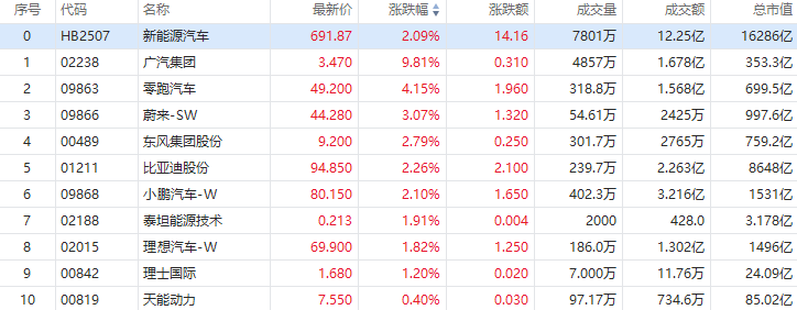 新能源汽车股盘初走高,广汽集团涨超9%,零跑汽车涨超4%,获纳入恒生科技指数;蔚来-SW涨超3%,小鹏汽车-W涨超2%。