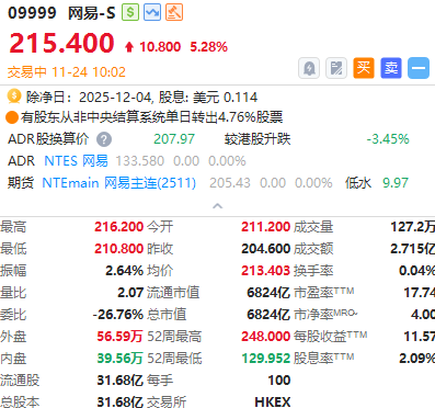 网易-S涨超5%,截至发稿,涨5.28%,报215.4港元,成交额2.715亿港元。