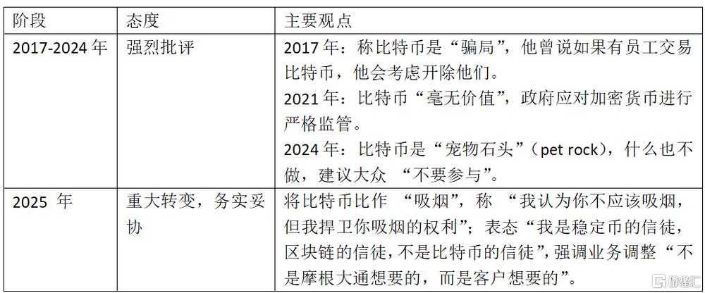 2025年以后,特朗普政府上台,美国加密资产监管政策出现180度大转弯,戴蒙的态度转向务实,允许客户购买比特币,开放交易通道,虽强调“不托管,但会列在账户报表中”。 7 月,美国《稳定币法案》签署后,戴蒙明确支持稳定币,称 “客户想要,我们就提供”。