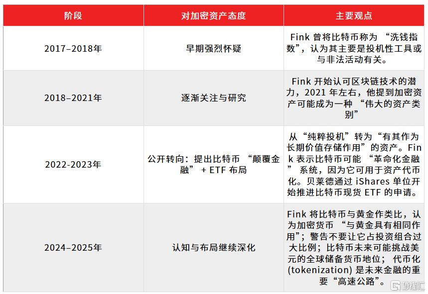 早期贝莱德也是对加密资产持消极态度,2017年,CEO拉里·芬克公开称比特币为 "洗钱的指数" ,对加密货币持明确否定态度,认为其与非法活动关联密切。此后逐渐松动,进而转向接纳。