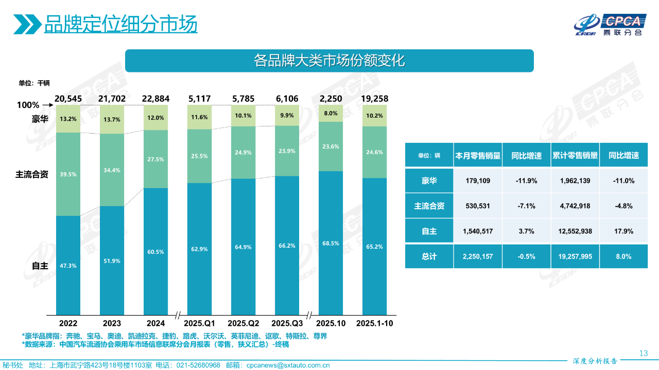 根据乘联会数据,今年1-10月,豪华品牌累计零售销量196.2万辆,同比下滑11%;主流合资品牌则为474.3万辆,同比下滑4.8%。