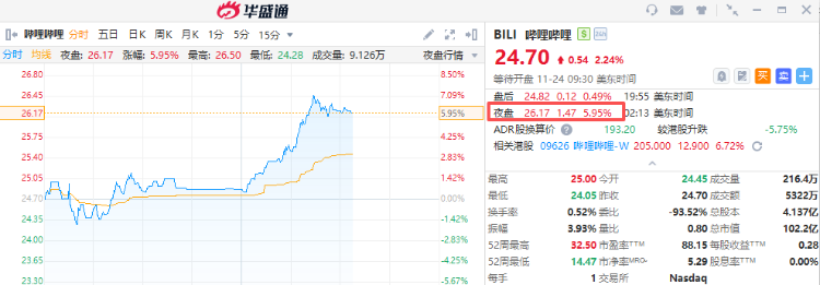 高盛则表示,哔哩哔哩正在维持具质素内容生态,具强劲用户连结,以及通过更佳广告转化及AI技术以将流量变现,以及明年新游戏产品管线有望带动业务潜在上行。该行维持对其“买入”评级,H股目标价由234港元升至240港元,美股目标价由30美元升至30.8美元。