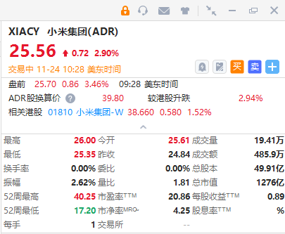 华盛资讯11月24日讯,小米集团ADR $XIACY 续涨近3%,雷军增持小米超1亿港元,小米集团今年累计回购已超23亿港元;