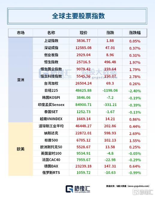 美股方面,三大指数集体收涨,道琼斯指数涨0.44%,标普500指数涨1.55%,纳指涨2.69%飙升近600点。