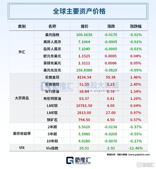 全球资产表现上,WTI 1月原油期货收涨0.78美元,涨幅1.34%,报58.84美元/桶。布伦特1月原油期货收涨0.81美元,涨幅1.29%,报63.37美元/桶。国际金价重回4100美元,现货黄金涨1.46%,报4134.34美元/盎司;现货白银涨2.45%,报51.35美元/盎司。