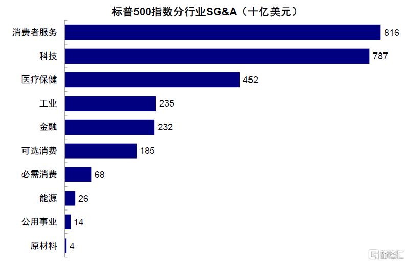 图表:标普500指数SG&A总规模约3万亿美元,若平均降低9~11%约为3000亿美元