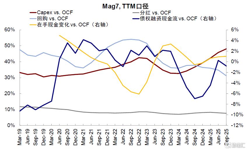 本轮AI行情中,Mag 7的资本开支来源相对多元。1)目前Mag 7的资本开支和债权融资节奏相关性较差,债权融资对资本开支尚不存在明显边际影响;2)债权融资现金流占OCF的比重在零附近,互联网革命行情中Dotcom 5的债权融资现金流占比高点约14.1%;3)Mag 7其他现金流量(如回购等)都出现收缩迹象。