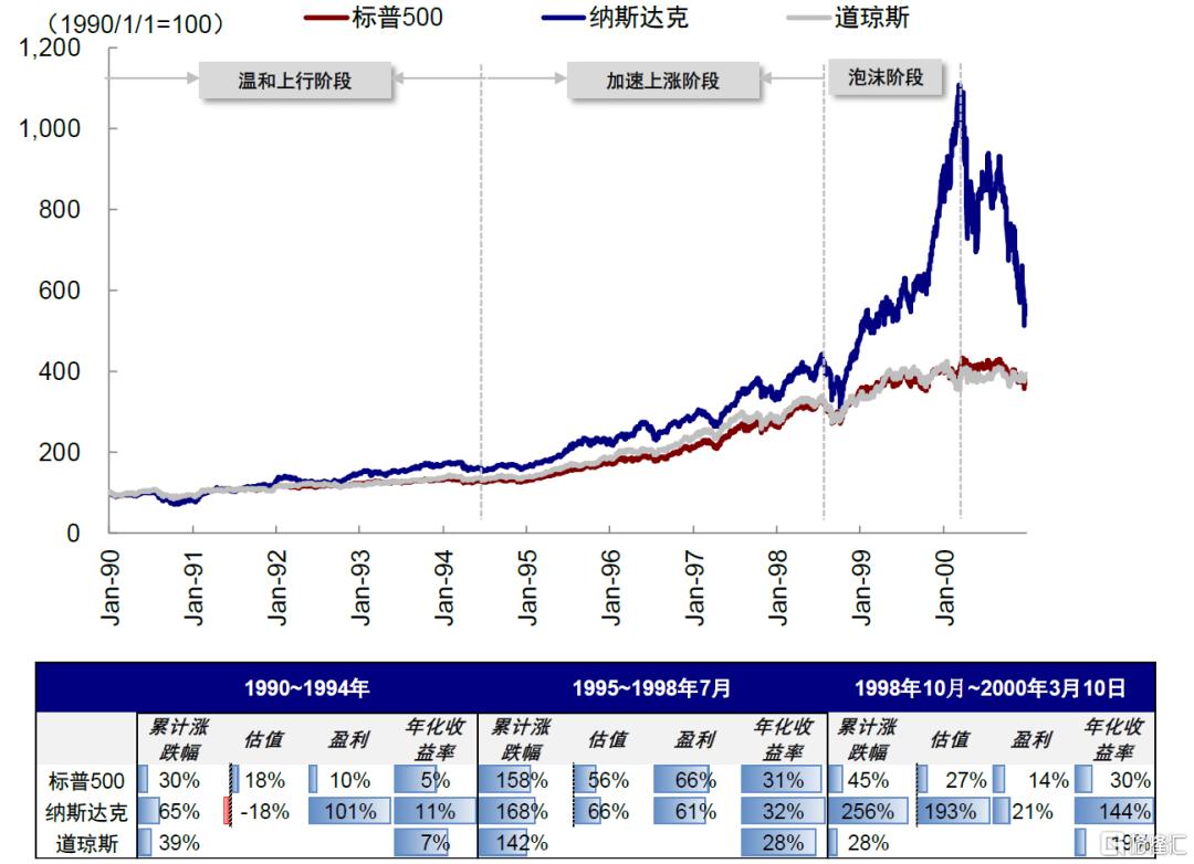 ► 第二,如果任何一个产业趋势最终以泡沫收场,也不应该在泡沫形成阶段过早离场。以1998年10月到2000年3月泡沫形成期为例,盈利大幅下滑但估值快速扩张,带动纳斯达克指数在15个月内累计上涨256%,年化收益达到144%,相当于1995~1998年快速上涨期的4.5倍(年化收益率32%)。因此,讨论的关键不在于否认泡沫,而在于确认现在处于哪个阶段。