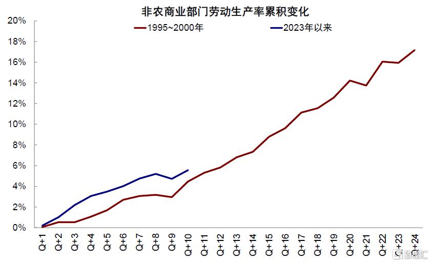 ► 内生降本增效:AI应用已经开始带来明显的成本节省。麦肯锡调查显示,受访者表示当前使用AI可减少9~11%的成本。如果仅粗略的从标普500的维度来看,SG&A总规模约3万亿美元,约等于一年可以节省3000亿美元的成本,相当于Open AI 200亿美元年化收入[3]的15倍。劳动生产率提升速度更快。自2023年以来,非农商业部门的劳动生产率已经抬升5.6%,提升速度快于1995~2000年互联网革命时期,抬升幅度接近1997年底水平。
