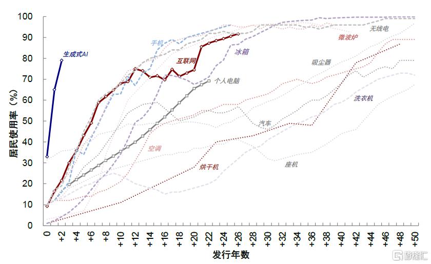 图表:生成式AI技术普及率已经升至79%,速度远超此前的个人电脑和互联网技术
