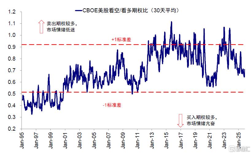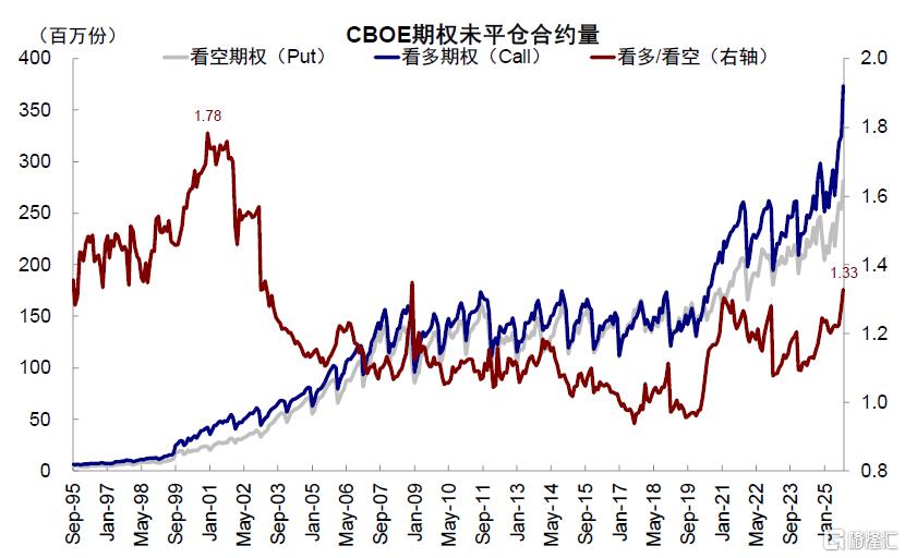 投资者情绪尚未达到泡沫时的亢奋程度,看空/看多期权并未回落至1998~2000年的极端水平,AAII个人投资者情绪也已经大幅降温,当前净看多比例持续回落至-5%,与2000年1月的46%有显著差距。但杠杆水平却创历史新高,这也或放大短期波动。FINRA统计的融资余额隐含杠杆水平在2000年3月泡沫破裂前升至1.85,而截至2025年10月底的最新数据显示隐含杠杆水平已经突破3,CBOE未平仓看多期权量也创下3.7亿份的新高,但看多/看空比例1.3相较于2000年的1.8倍仍有距离。