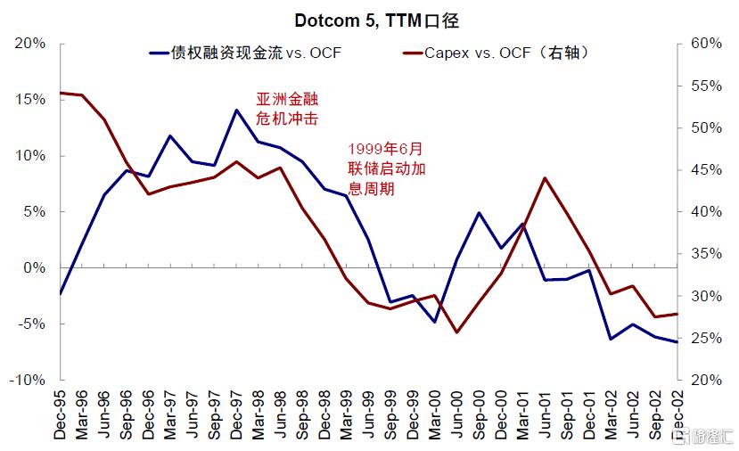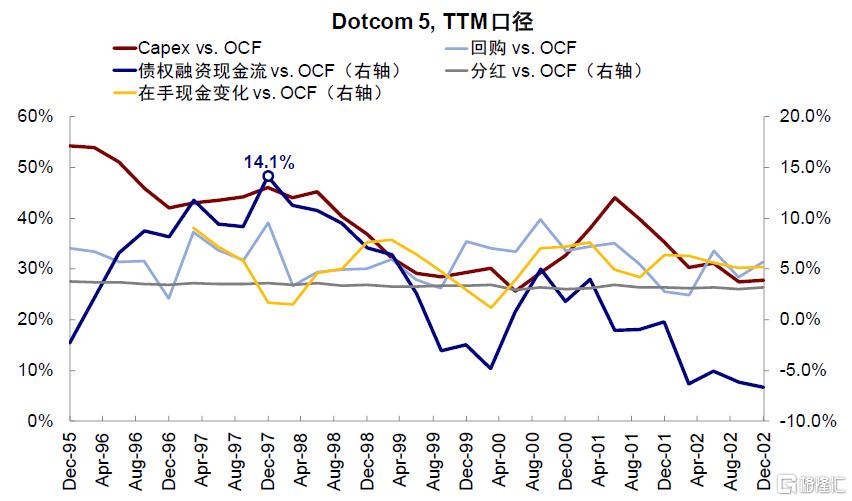从流量视角看,通过拆解现金流量表发现:互联网革命时期,Dotcom 5的资本开支对债权融资形成较强依赖。1)彼时Dotcom 5的资本开支(capex vs. OCF)节奏和债权融资(债权融资现金流 vs. OCF)高度相关,且资本开支节奏滞后于债权融资节奏,说明了两者的联系;2)分红与回购强度(vs. OCF)在彼时相对平稳,头部公司整体上仍保持一定股东回报水平。